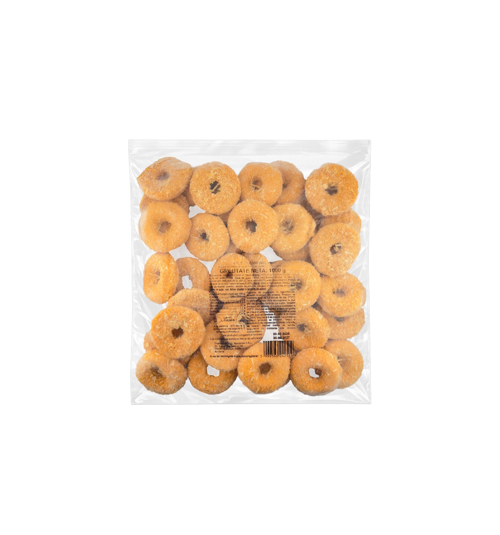 Ingrediente: pane (pesmet [făină de GRÂU, sare, drojdie, coloranți (extracte de boia)], apă, făină de GRÂU, fâșii de cartofi [cartofi, amidon din cartofi, conservant (metabisulfit de sodiu)], sare, amestec de boia (boia măcinată, extracte de boia)), BRÂNZĂ Trappista 35% (LAPTE, sare, culturi, clorură de calciu, enzime), apă, ulei de floarea-soarelui, amidon de porumb. Produsul poate conține SOIA, OU, ȚELINĂ, MUȘTAR și SEMINȚE DE SUSAN.