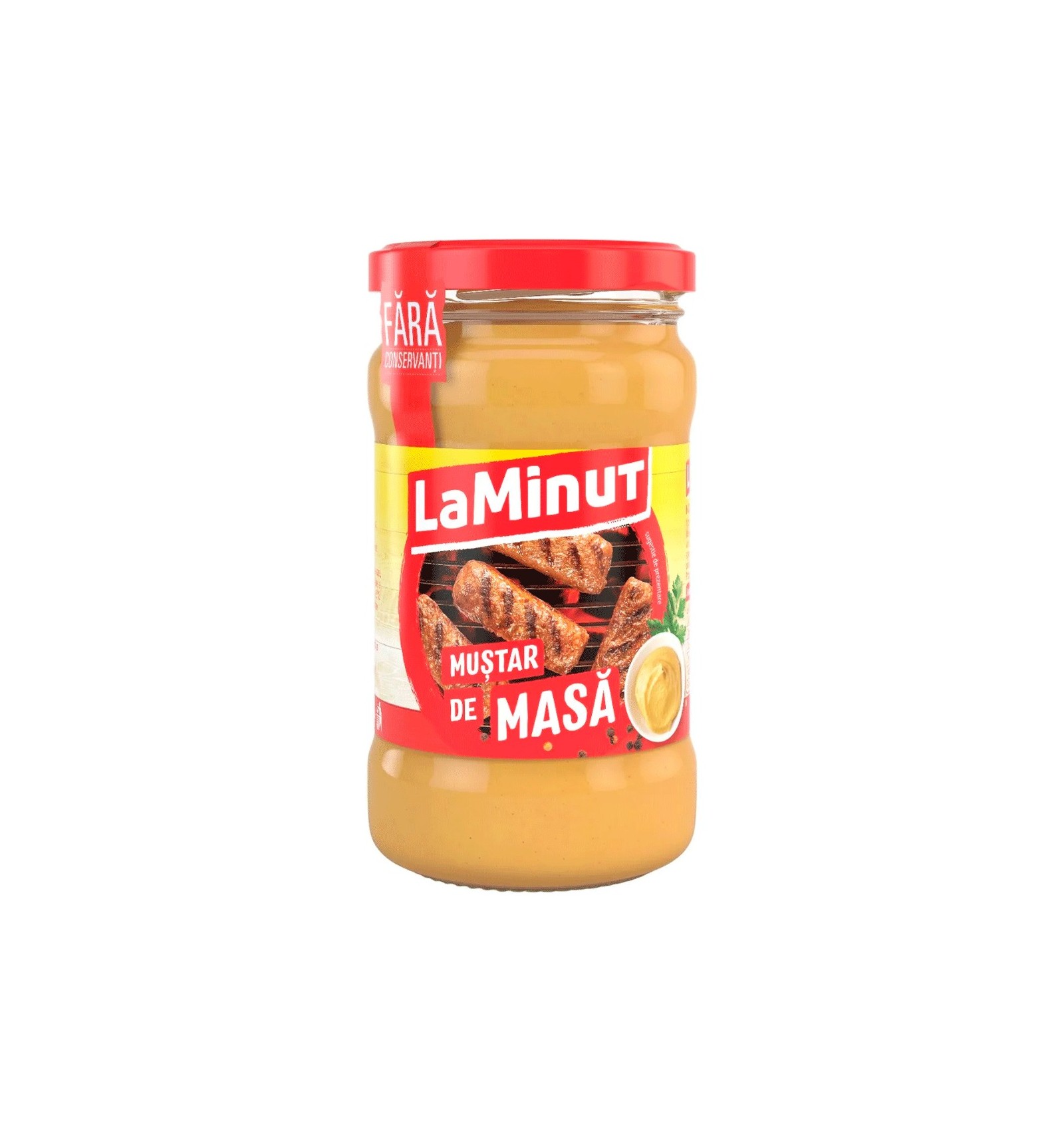 Ingrediente: Apa, boabe de MUSTAR 16% (de origine din UE si din afara UE), otet din alcool, zahar, sare, acidifiant (acid citric), agent de ingrosare (guma de xantan), condimente, colorant (beta-caroten).
