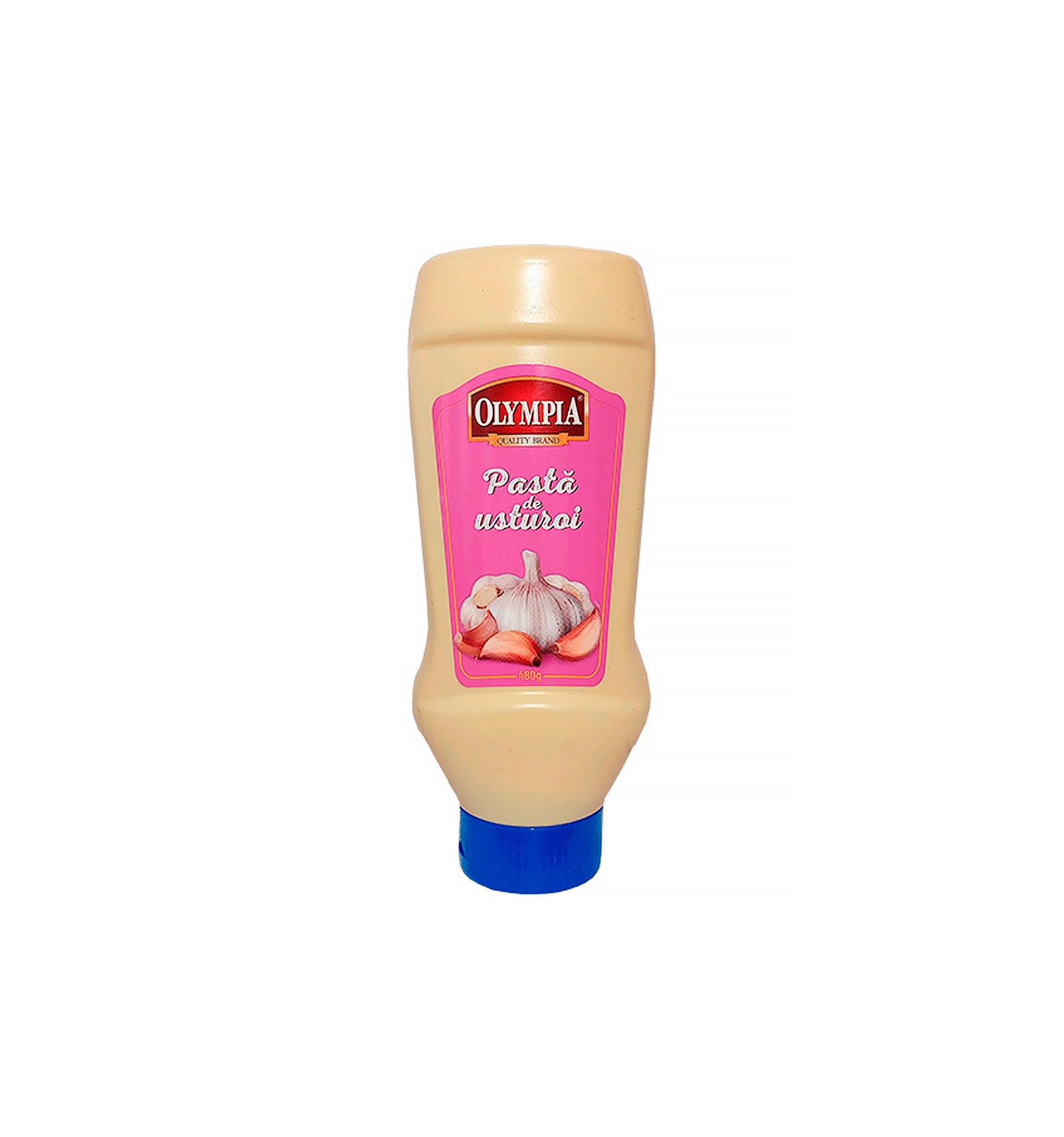 Ingrediente: apa, ulei vegetal de floarea soarelui, amidon modificat din porumb, zahar, sare iodata, usturoi deshidratat, alcool din otet, acidifiant (acid citric), stabilizatori (guma guar, guma xantan), conservanti (benzoat de sodiu, sorbat de potasiu), antioxidant (calciu disodic)
