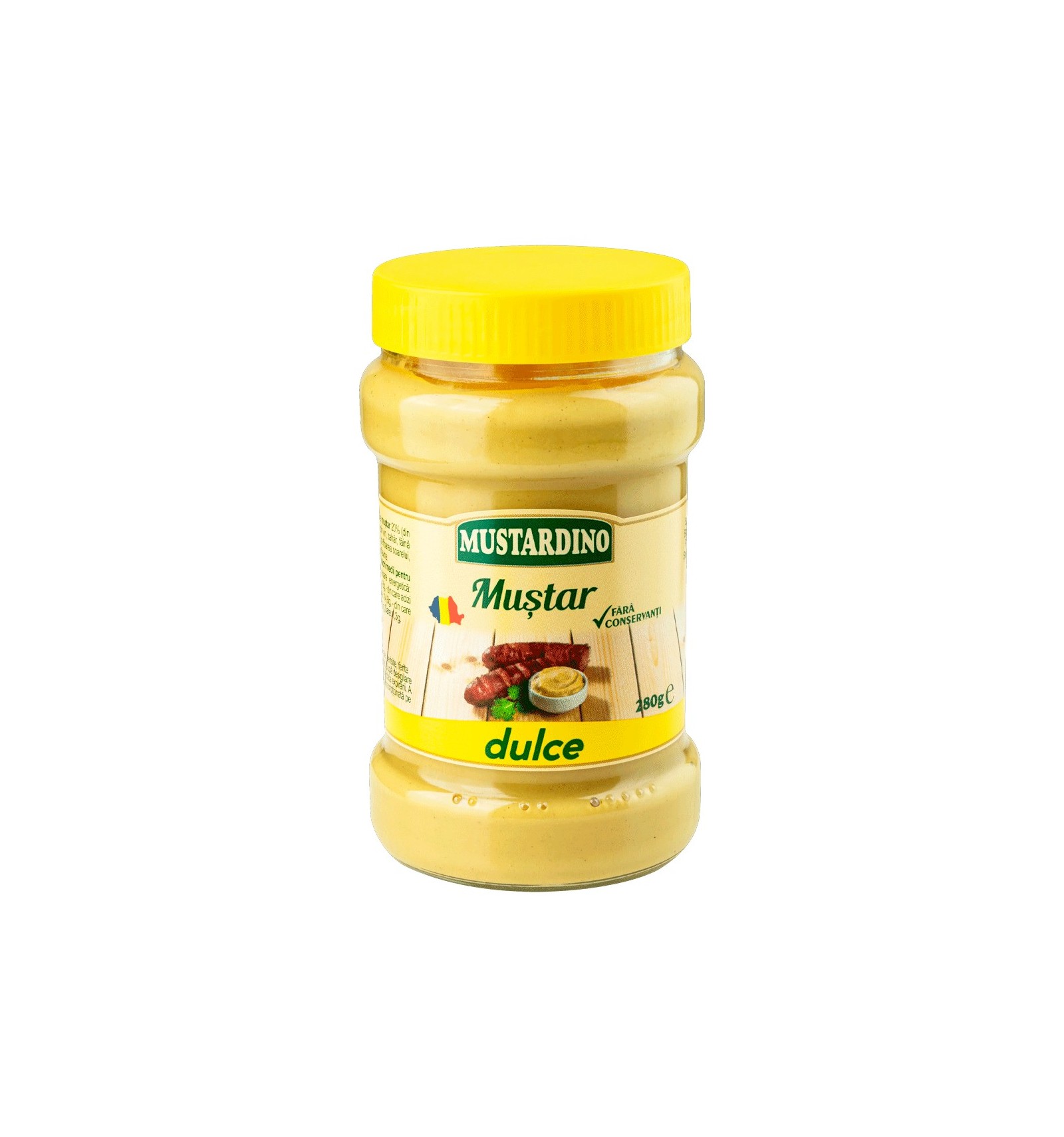 Ingrediente: apă, făină de muștar 20%, oțet de alcool, făină de grâu, zahăr, sare iodată, ulei de floarea-soarelui, colorant (riboflavină), condimente.